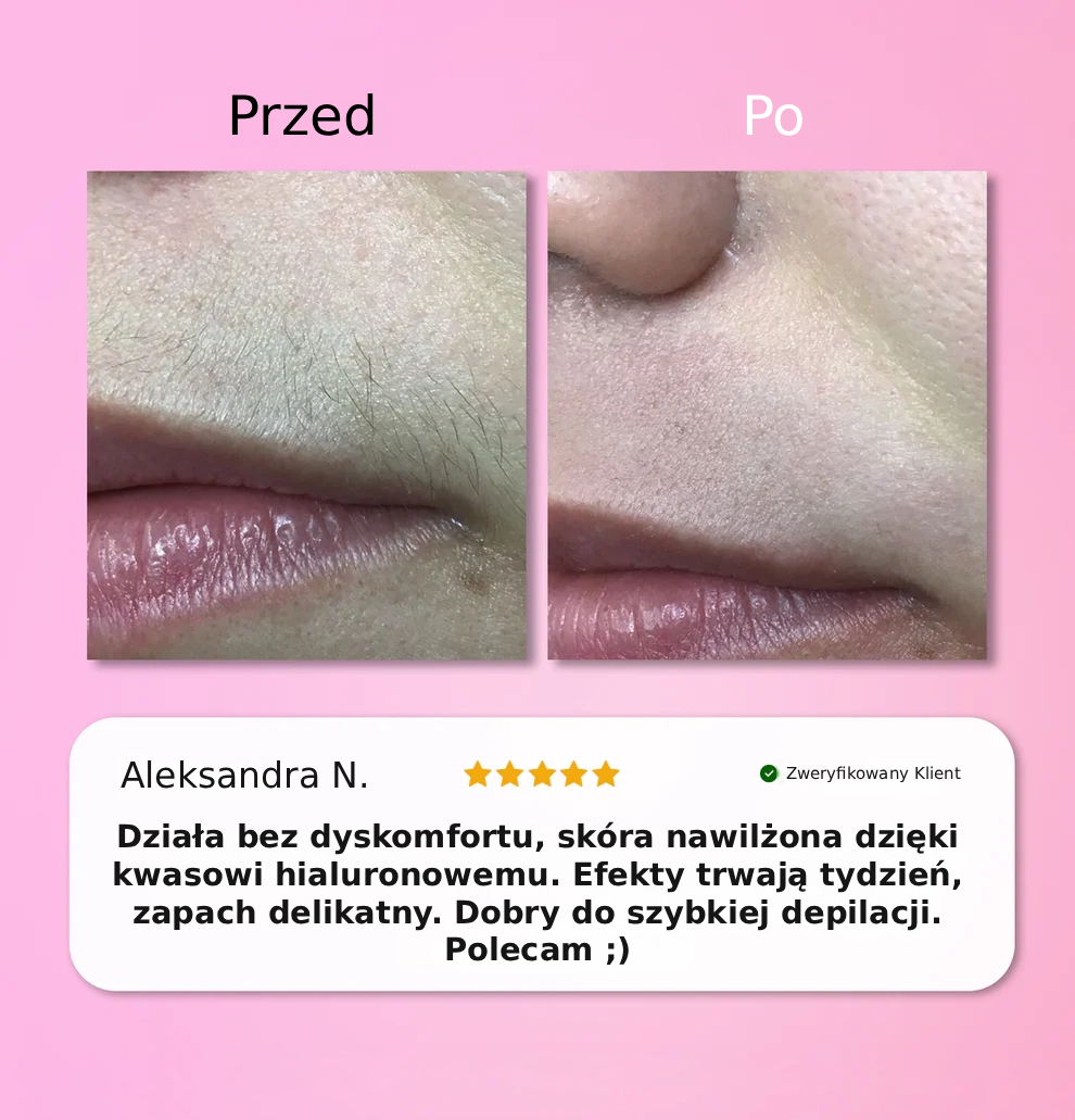 - p-Styrenowy etylowy keton i heksylogliceryd: Warstwią skórę i poprawiają teksturę kremu, oferując łagodne, skuteczne doświadczenie depilacji.